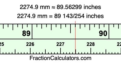 One millimeter is equal to 5/127 inches, and 2274.9 as a fraction is 22749/10. Therefore, to get the fractional answer to 2274.9 mm in inches, we multiply 22749/10 by 5/127 and simplify if necessary.