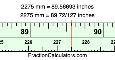 One millimeter is equal to 5/127 inches, and 2275 as a fraction is 2275/1. Therefore, to get the fractional answer to 2275 mm in inches, we multiply 2275/1 by 5/127 and simplify if necessary.
