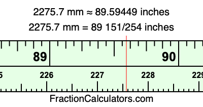 One millimeter is equal to 5/127 inches, and 2275.7 as a fraction is 22757/10. Therefore, to get the fractional answer to 2275.7 mm in inches, we multiply 22757/10 by 5/127 and simplify if necessary.