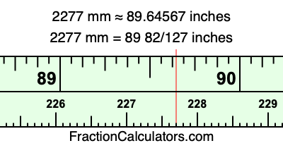 One millimeter is equal to 5/127 inches, and 2277 as a fraction is 2277/1. Therefore, to get the fractional answer to 2277 mm in inches, we multiply 2277/1 by 5/127 and simplify if necessary.