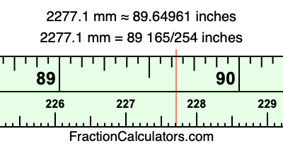 One millimeter is equal to 5/127 inches, and 2277.1 as a fraction is 22771/10. Therefore, to get the fractional answer to 2277.1 mm in inches, we multiply 22771/10 by 5/127 and simplify if necessary.