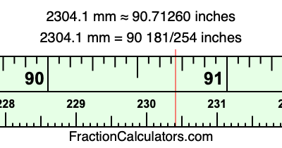 One millimeter is equal to 5/127 inches, and 2304.1 as a fraction is 23041/10. Therefore, to get the fractional answer to 2304.1 mm in inches, we multiply 23041/10 by 5/127 and simplify if necessary.