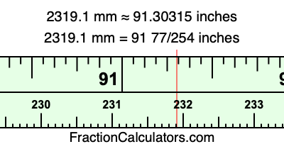 Here is how to convert 2319.1 mm to inches. We will give you the fractional answer, the decimal answer, and illustrate the answer on our tape measure.