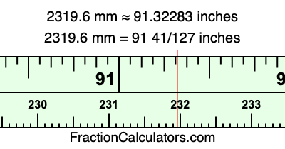 One millimeter is equal to 5/127 inches, and 2319.6 as a fraction is 11598/5. Therefore, to get the fractional answer to 2319.6 mm in inches, we multiply 11598/5 by 5/127 and simplify if necessary.