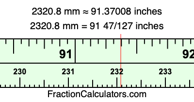 One millimeter is equal to 5/127 inches, and 2320.8 as a fraction is 11604/5. Therefore, to get the fractional answer to 2320.8 mm in inches, we multiply 11604/5 by 5/127 and simplify if necessary.
