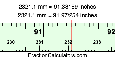One millimeter is equal to 5/127 inches, and 2321.1 as a fraction is 23211/10. Therefore, to get the fractional answer to 2321.1 mm in inches, we multiply 23211/10 by 5/127 and simplify if necessary.