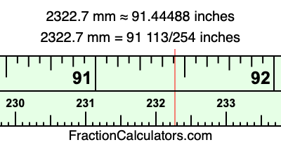 One millimeter is equal to 5/127 inches, and 2322.7 as a fraction is 23227/10. Therefore, to get the fractional answer to 2322.7 mm in inches, we multiply 23227/10 by 5/127 and simplify if necessary.