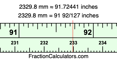 One millimeter is equal to 5/127 inches, and 2329.8 as a fraction is 11649/5. Therefore, to get the fractional answer to 2329.8 mm in inches, we multiply 11649/5 by 5/127 and simplify if necessary.