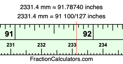 One millimeter is equal to 5/127 inches, and 2331.4 as a fraction is 11657/5. Therefore, to get the fractional answer to 2331.4 mm in inches, we multiply 11657/5 by 5/127 and simplify if necessary.