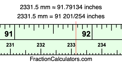One millimeter is equal to 5/127 inches, and 2331.5 as a fraction is 4663/2. Therefore, to get the fractional answer to 2331.5 mm in inches, we multiply 4663/2 by 5/127 and simplify if necessary.