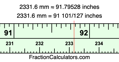 One millimeter is equal to 5/127 inches, and 2331.6 as a fraction is 11658/5. Therefore, to get the fractional answer to 2331.6 mm in inches, we multiply 11658/5 by 5/127 and simplify if necessary.