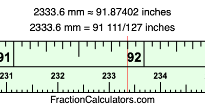 One millimeter is equal to 5/127 inches, and 2333.6 as a fraction is 11668/5. Therefore, to get the fractional answer to 2333.6 mm in inches, we multiply 11668/5 by 5/127 and simplify if necessary.