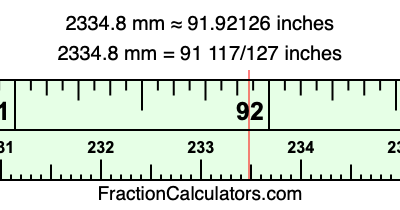 One millimeter is equal to 5/127 inches, and 2334.8 as a fraction is 11674/5. Therefore, to get the fractional answer to 2334.8 mm in inches, we multiply 11674/5 by 5/127 and simplify if necessary.