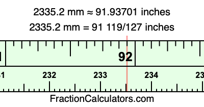 One millimeter is equal to 5/127 inches, and 2335.2 as a fraction is 11676/5. Therefore, to get the fractional answer to 2335.2 mm in inches, we multiply 11676/5 by 5/127 and simplify if necessary.