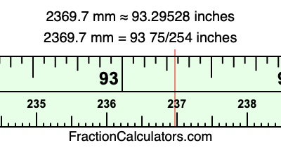 One millimeter is equal to 5/127 inches, and 2369.7 as a fraction is 23697/10. Therefore, to get the fractional answer to 2369.7 mm in inches, we multiply 23697/10 by 5/127 and simplify if necessary.