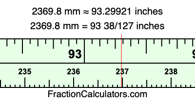 One millimeter is equal to 5/127 inches, and 2369.8 as a fraction is 11849/5. Therefore, to get the fractional answer to 2369.8 mm in inches, we multiply 11849/5 by 5/127 and simplify if necessary.