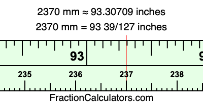 One millimeter is equal to 5/127 inches, and 2370 as a fraction is 2370/1. Therefore, to get the fractional answer to 2370 mm in inches, we multiply 2370/1 by 5/127 and simplify if necessary.