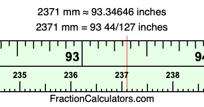 One millimeter is equal to 5/127 inches, and 2371 as a fraction is 2371/1. Therefore, to get the fractional answer to 2371 mm in inches, we multiply 2371/1 by 5/127 and simplify if necessary.