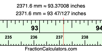 One millimeter is equal to 5/127 inches, and 2371.6 as a fraction is 11858/5. Therefore, to get the fractional answer to 2371.6 mm in inches, we multiply 11858/5 by 5/127 and simplify if necessary.