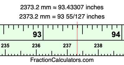 One millimeter is equal to 5/127 inches, and 2373.2 as a fraction is 11866/5. Therefore, to get the fractional answer to 2373.2 mm in inches, we multiply 11866/5 by 5/127 and simplify if necessary.