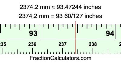 Here is how to convert 2374.2 mm to inches. We will give you the fractional answer, the decimal answer, and illustrate the answer on our tape measure.