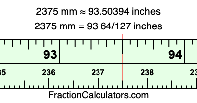 One millimeter is equal to 5/127 inches, and 2375 as a fraction is 2375/1. Therefore, to get the fractional answer to 2375 mm in inches, we multiply 2375/1 by 5/127 and simplify if necessary.