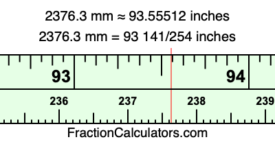 One millimeter is equal to 5/127 inches, and 2376.3 as a fraction is 23763/10. Therefore, to get the fractional answer to 2376.3 mm in inches, we multiply 23763/10 by 5/127 and simplify if necessary.