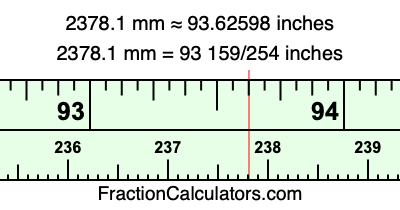 One millimeter is equal to 5/127 inches, and 2378.1 as a fraction is 23781/10. Therefore, to get the fractional answer to 2378.1 mm in inches, we multiply 23781/10 by 5/127 and simplify if necessary.