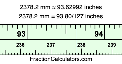 One millimeter is equal to 5/127 inches, and 2378.2 as a fraction is 11891/5. Therefore, to get the fractional answer to 2378.2 mm in inches, we multiply 11891/5 by 5/127 and simplify if necessary.