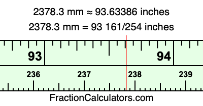 One millimeter is equal to 5/127 inches, and 2378.3 as a fraction is 23783/10. Therefore, to get the fractional answer to 2378.3 mm in inches, we multiply 23783/10 by 5/127 and simplify if necessary.