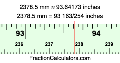 One millimeter is equal to 5/127 inches, and 2378.5 as a fraction is 4757/2. Therefore, to get the fractional answer to 2378.5 mm in inches, we multiply 4757/2 by 5/127 and simplify if necessary.