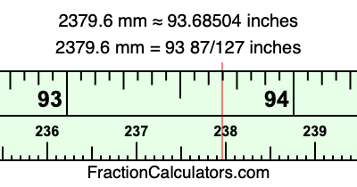 One millimeter is equal to 5/127 inches, and 2379.6 as a fraction is 11898/5. Therefore, to get the fractional answer to 2379.6 mm in inches, we multiply 11898/5 by 5/127 and simplify if necessary.