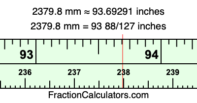 One millimeter is equal to 5/127 inches, and 2379.8 as a fraction is 11899/5. Therefore, to get the fractional answer to 2379.8 mm in inches, we multiply 11899/5 by 5/127 and simplify if necessary.