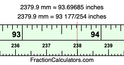One millimeter is equal to 5/127 inches, and 2379.9 as a fraction is 23799/10. Therefore, to get the fractional answer to 2379.9 mm in inches, we multiply 23799/10 by 5/127 and simplify if necessary.