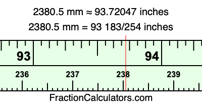 One millimeter is equal to 5/127 inches, and 2380.5 as a fraction is 4761/2. Therefore, to get the fractional answer to 2380.5 mm in inches, we multiply 4761/2 by 5/127 and simplify if necessary.