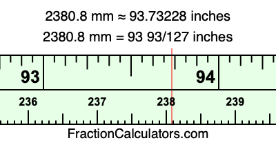 One millimeter is equal to 5/127 inches, and 2380.8 as a fraction is 11904/5. Therefore, to get the fractional answer to 2380.8 mm in inches, we multiply 11904/5 by 5/127 and simplify if necessary.
