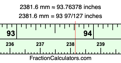 One millimeter is equal to 5/127 inches, and 2381.6 as a fraction is 11908/5. Therefore, to get the fractional answer to 2381.6 mm in inches, we multiply 11908/5 by 5/127 and simplify if necessary.