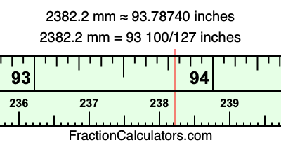 One millimeter is equal to 5/127 inches, and 2382.2 as a fraction is 11911/5. Therefore, to get the fractional answer to 2382.2 mm in inches, we multiply 11911/5 by 5/127 and simplify if necessary.