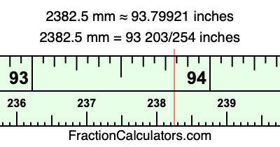 One millimeter is equal to 5/127 inches, and 2382.5 as a fraction is 4765/2. Therefore, to get the fractional answer to 2382.5 mm in inches, we multiply 4765/2 by 5/127 and simplify if necessary.