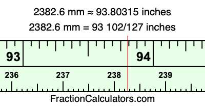One millimeter is equal to 5/127 inches, and 2382.6 as a fraction is 11913/5. Therefore, to get the fractional answer to 2382.6 mm in inches, we multiply 11913/5 by 5/127 and simplify if necessary.