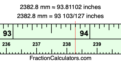 One millimeter is equal to 5/127 inches, and 2382.8 as a fraction is 11914/5. Therefore, to get the fractional answer to 2382.8 mm in inches, we multiply 11914/5 by 5/127 and simplify if necessary.