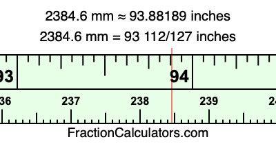 One millimeter is equal to 5/127 inches, and 2384.6 as a fraction is 11923/5. Therefore, to get the fractional answer to 2384.6 mm in inches, we multiply 11923/5 by 5/127 and simplify if necessary.