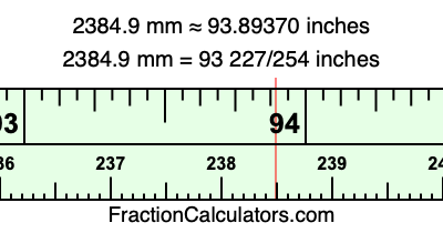 One millimeter is equal to 5/127 inches, and 2384.9 as a fraction is 23849/10. Therefore, to get the fractional answer to 2384.9 mm in inches, we multiply 23849/10 by 5/127 and simplify if necessary.