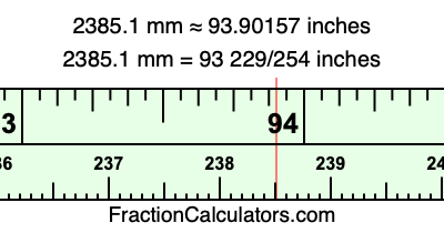 One millimeter is equal to 5/127 inches, and 2385.1 as a fraction is 23851/10. Therefore, to get the fractional answer to 2385.1 mm in inches, we multiply 23851/10 by 5/127 and simplify if necessary.