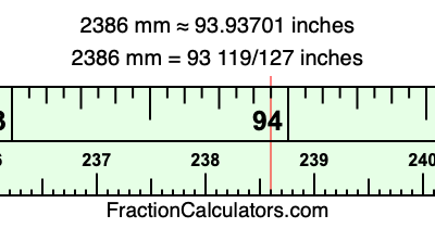 One millimeter is equal to 5/127 inches, and 2386 as a fraction is 2386/1. Therefore, to get the fractional answer to 2386 mm in inches, we multiply 2386/1 by 5/127 and simplify if necessary.
