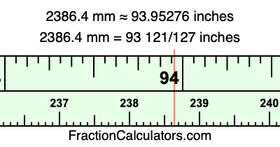 One millimeter is equal to 5/127 inches, and 2386.4 as a fraction is 11932/5. Therefore, to get the fractional answer to 2386.4 mm in inches, we multiply 11932/5 by 5/127 and simplify if necessary.