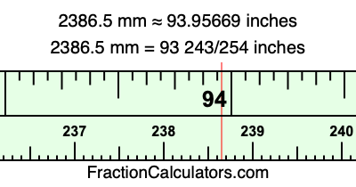 One millimeter is equal to 5/127 inches, and 2386.5 as a fraction is 4773/2. Therefore, to get the fractional answer to 2386.5 mm in inches, we multiply 4773/2 by 5/127 and simplify if necessary.