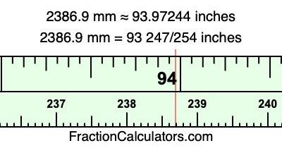 One millimeter is equal to 5/127 inches, and 2386.9 as a fraction is 23869/10. Therefore, to get the fractional answer to 2386.9 mm in inches, we multiply 23869/10 by 5/127 and simplify if necessary.