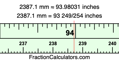 One millimeter is equal to 5/127 inches, and 2387.1 as a fraction is 23871/10. Therefore, to get the fractional answer to 2387.1 mm in inches, we multiply 23871/10 by 5/127 and simplify if necessary.