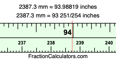 One millimeter is equal to 5/127 inches, and 2387.3 as a fraction is 23873/10. Therefore, to get the fractional answer to 2387.3 mm in inches, we multiply 23873/10 by 5/127 and simplify if necessary.